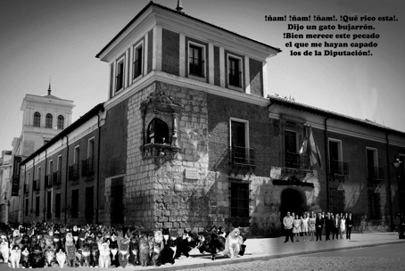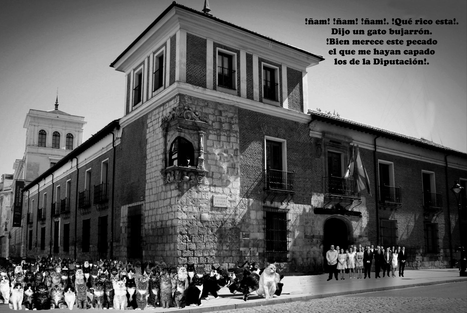 Entre los grandes servicios que presta a la humanidad la excelentísima Diputación de Valladolid está la captura, capa (de capar) y posterior mantenimiento de las colonias de gatos que se forman en algún barrio gracias a que cualquier enamorado los alimenta: se reproducen, crecen ... y la cosa se le va de las manos; entonces aparece la Diputación, contrata a algún grupo animalista para que se encargue de la faena y todo arreglado ... a costa del contribuyente y no del enamorado. Los ayuntamientos están encantados con la prestación de tan importante servicio y el de Tordesillas no cabe en sí de gozo, pues aunque prohíban nuestras tradiciones, nos compensan con la simpática presencia de algunos cientos de gatitos, por eso cantan las pandas en las limonadas: !Viva la buena gestión de nuestra Diputación!. !dadles tres hurras, muchachos!, que aunque parezcan gabachos son de Castilla y León. Hacemos botos (no votos) para que la Diputación dure mil años.